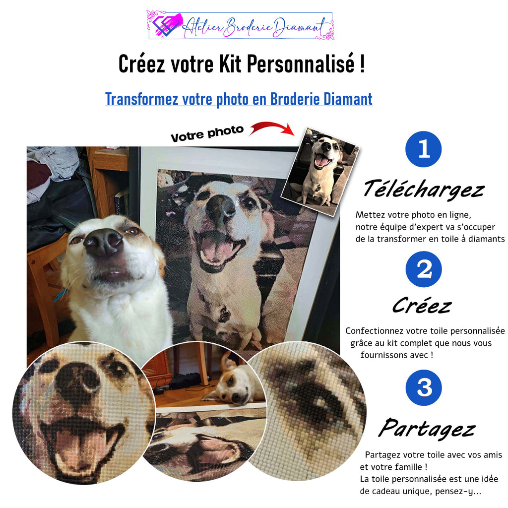 QUE DÎTES-VOUS DE TRANSFORMER VOTRE PHOTO PRÉFÉRÉE EN UNE BRODERIE DIAMANT PERSONNALISÉE UNIQUE ? AVOIR LE PRIVILÈGE DE PRATIQUER VOTRE ACTIVITÉ CRÉATIVE FAVORITE SUR UNE IMAGE QUI VOUS TIENT À CŒUR ET QUI REPRÉSENTE UN MOMENT EXQUIS DE VOTRE VIE ? C'EST DÉSORMAIS POSSIBLE GRÂCE À NOTRE TOILE CUSTOMISÉE : VOUS POUVEZ CONVERTIR ABSOLUMENT N'IMPORTE QUELLE IMAGE EN DIAMOND PAINTING QUI VOUS REPRÉSENTE LE MIEUX !