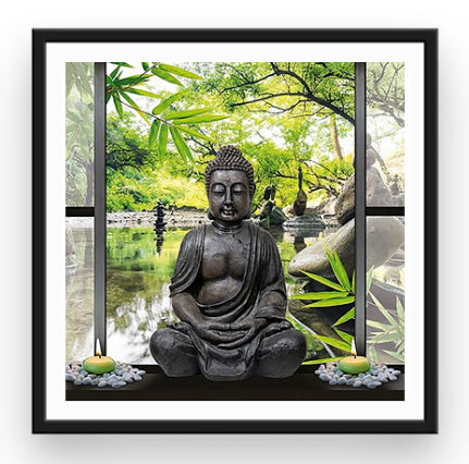 QUE DÎTES-VOUS D'UN MOMENT RELAXANT EN BRODANT CETTE SUPERBE TOILE ZEN ? BOUDDHA EFFECTUE SA PRIÈRE QUOTIDIENNE DANS UN DÉCOR RELAXANT DE VERDURE... IL NE MANQUE QU'À COLLER VOS DIAMANTS BRILLANTS SUR CETTE ŒUVRE !