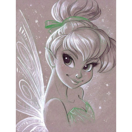 LA SUPERBE FÉE CLOCHETTE EST REPRÉSENTÉE ICI SUR UNE BRODERIE DIAMANT AUX ALLURES D'UNE PEINTURE. ON Y APERÇOIT DES ÉCLABOUSSURES BLANCHES, QUI DONNENT UN CERTAIN CHARME À CETTE TOILE. LA PETITE TOUCHE DE VERT SE MÊLE TRÈS BIEN AUX NUANCES POURPRES... QU'ATTENDEZ-VOUS POUR Y POSER VOS STRASS ?