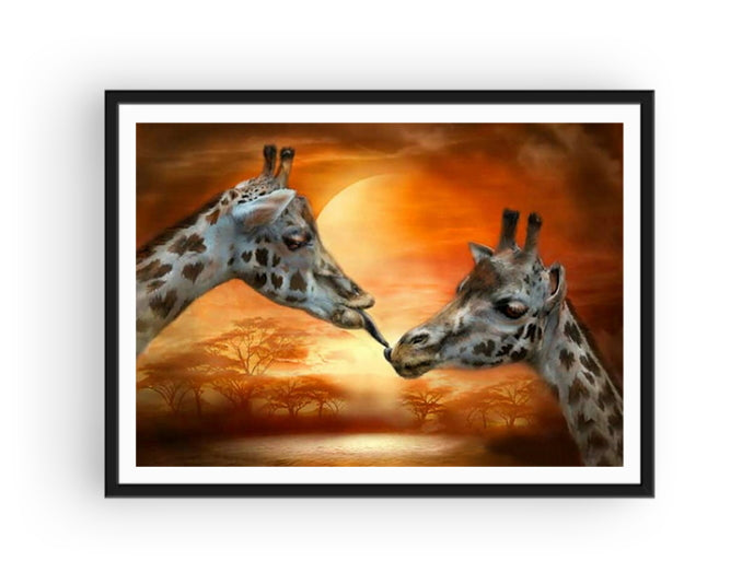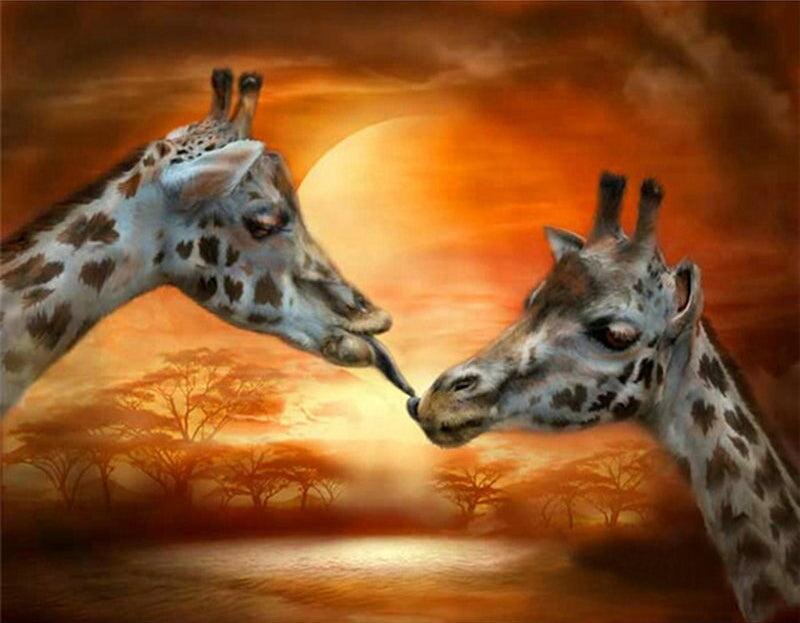 Ces géants animaux de la savane sont représentés devant ce magnifique coucher de soleil. Ils se regardent chaleureusement en tirant la langue... La Broderie Diamant Couple de Girafes est idéale pour les amoureux d'animaux et de créations manuelles : vos strass étincelants vous attendent pour une œuvre de qualité !