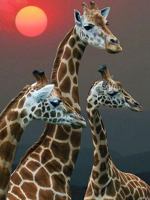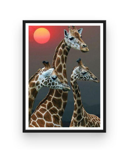 La prestance inégalée de ces animaux grandiose vous laissera de marbre. Cette Broderie Diamant Girafes et Soleil Couchant mêle à la fois un coucher de soleil splendide, et un groupe de trois girafes impressionnantes. Si vous aimez les animez : n'attendez plus et collez vos perles étincelantes sur cette œuvre unique !