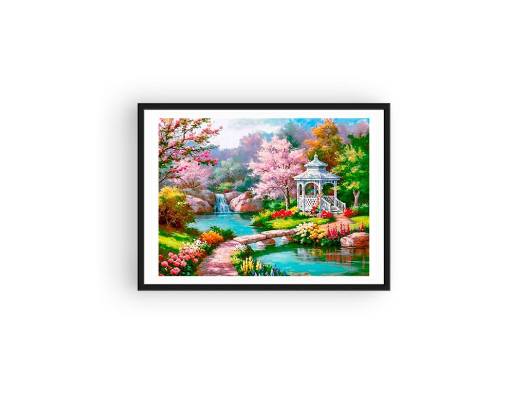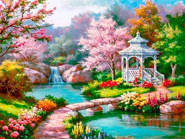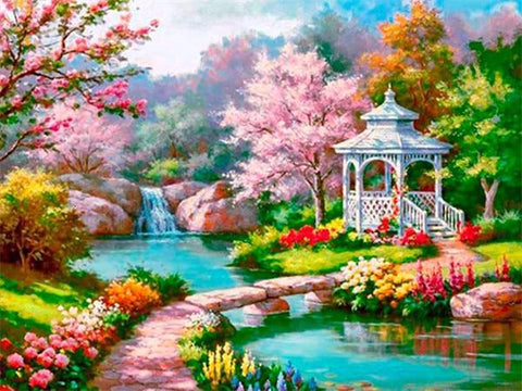 UNE MERVEILLEUSE RIVIÈRE ENTOURÉE DE FLEURS MULTICOLORES AINSI QU'UN JOLI KIOSQUE COMME DANS L'ANCIEN TEMPS. PEUT-ON MIEUX FAIRE COMME BRODERIE DIAMANT DE PAYSAGE ?