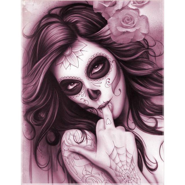 OSEZ CETTE SPLENDIDE BRODERIE DIAMANT REPRÉSENTANT UNE FEMME DÉGUISÉE POUR LA FÊTE DES MORTS MEXICAINE ! SON CÔTÉ REBELLE VOUS PLAIRA-T-IL ? EN TOUT CAS, L'UNIVERS DES TÊTES DE MORT PRÔNE SUR CETTE TOILE.